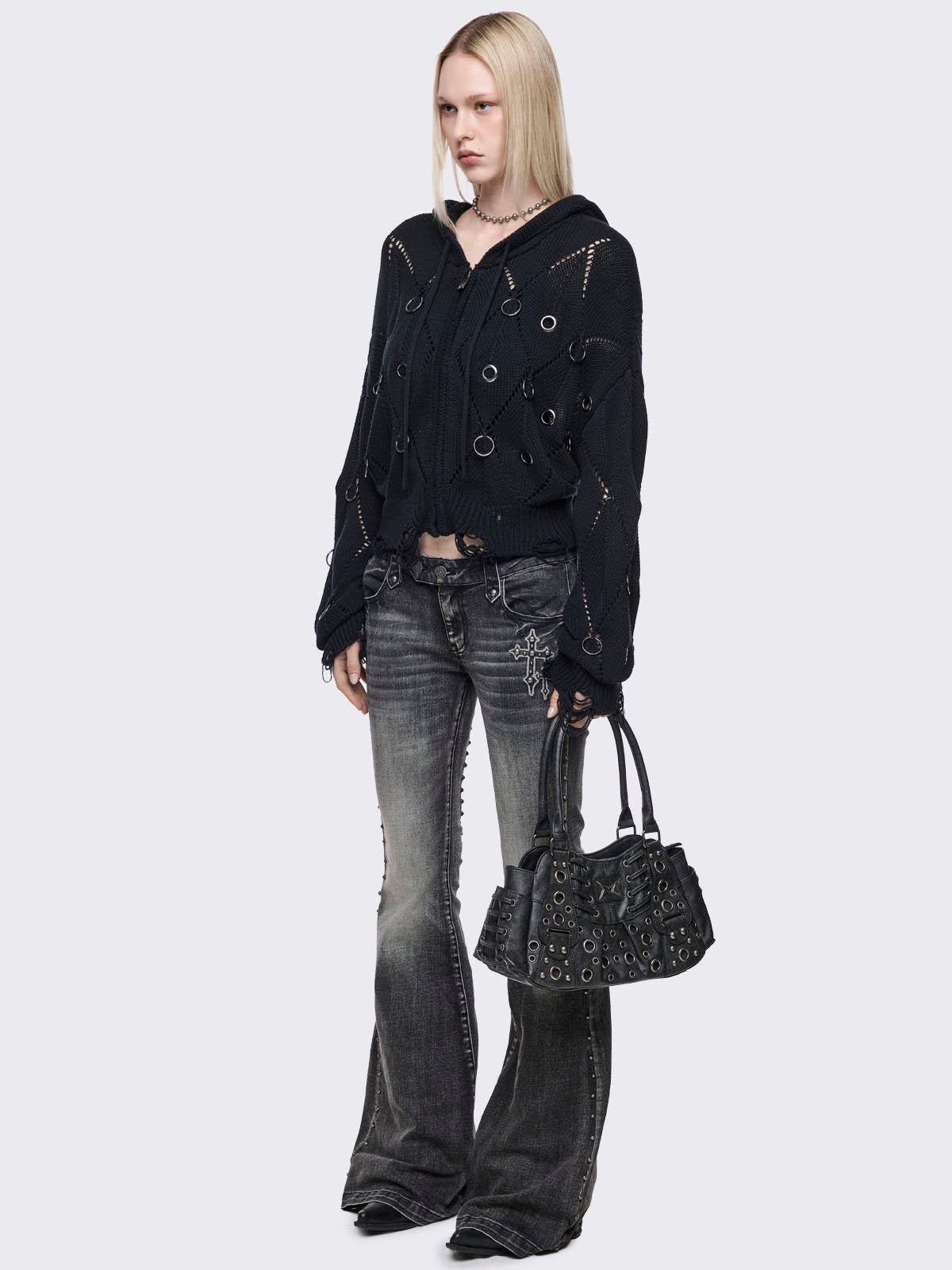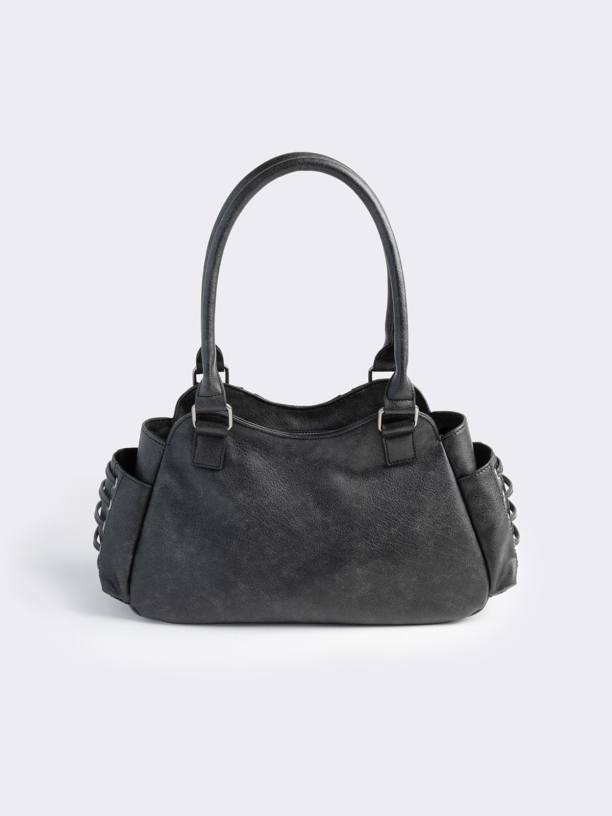 Black vegan leather shoulder bag with silver eyelets and multiple pockets