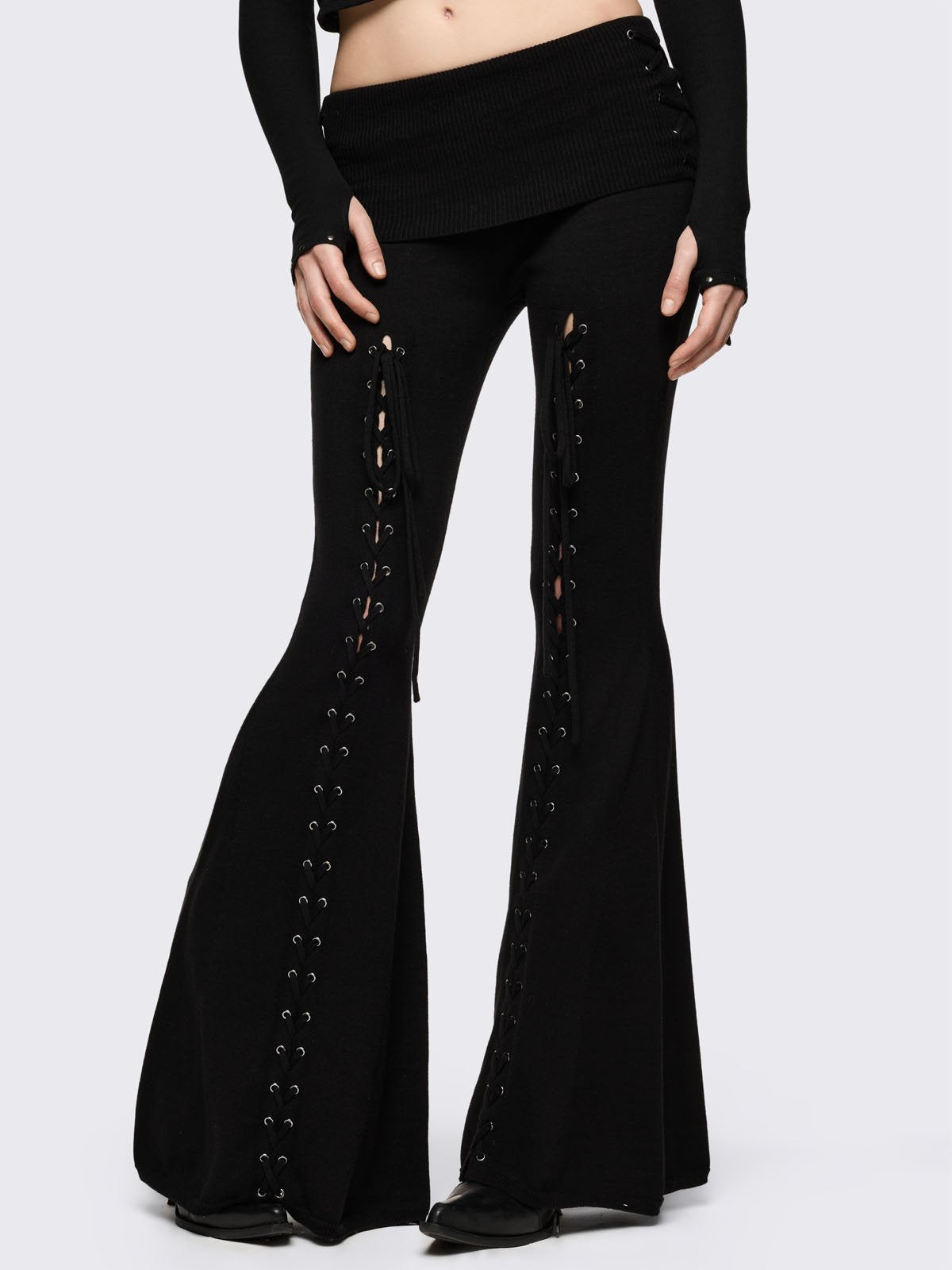 Black flare pants with front open lace-up corset details.