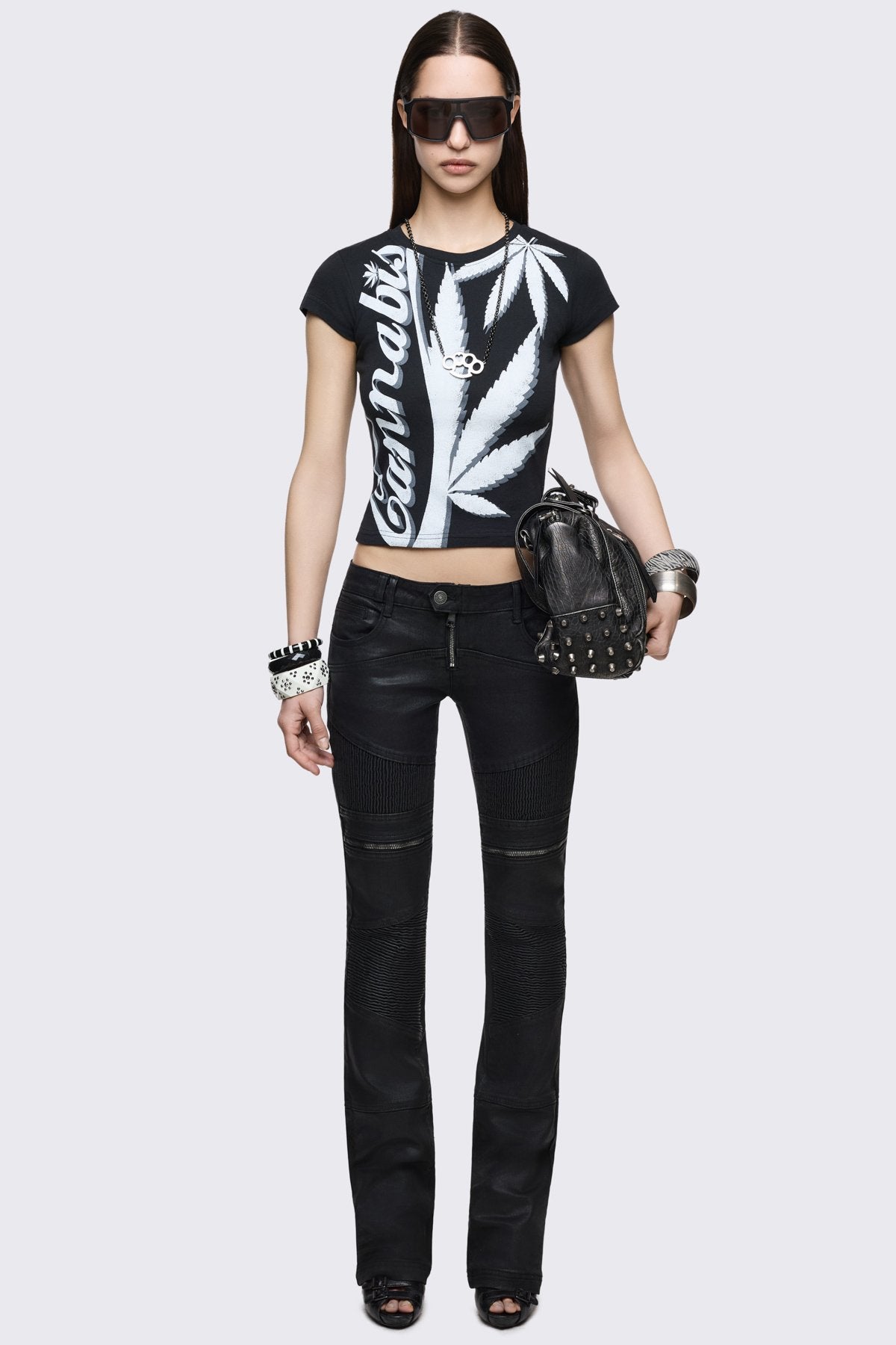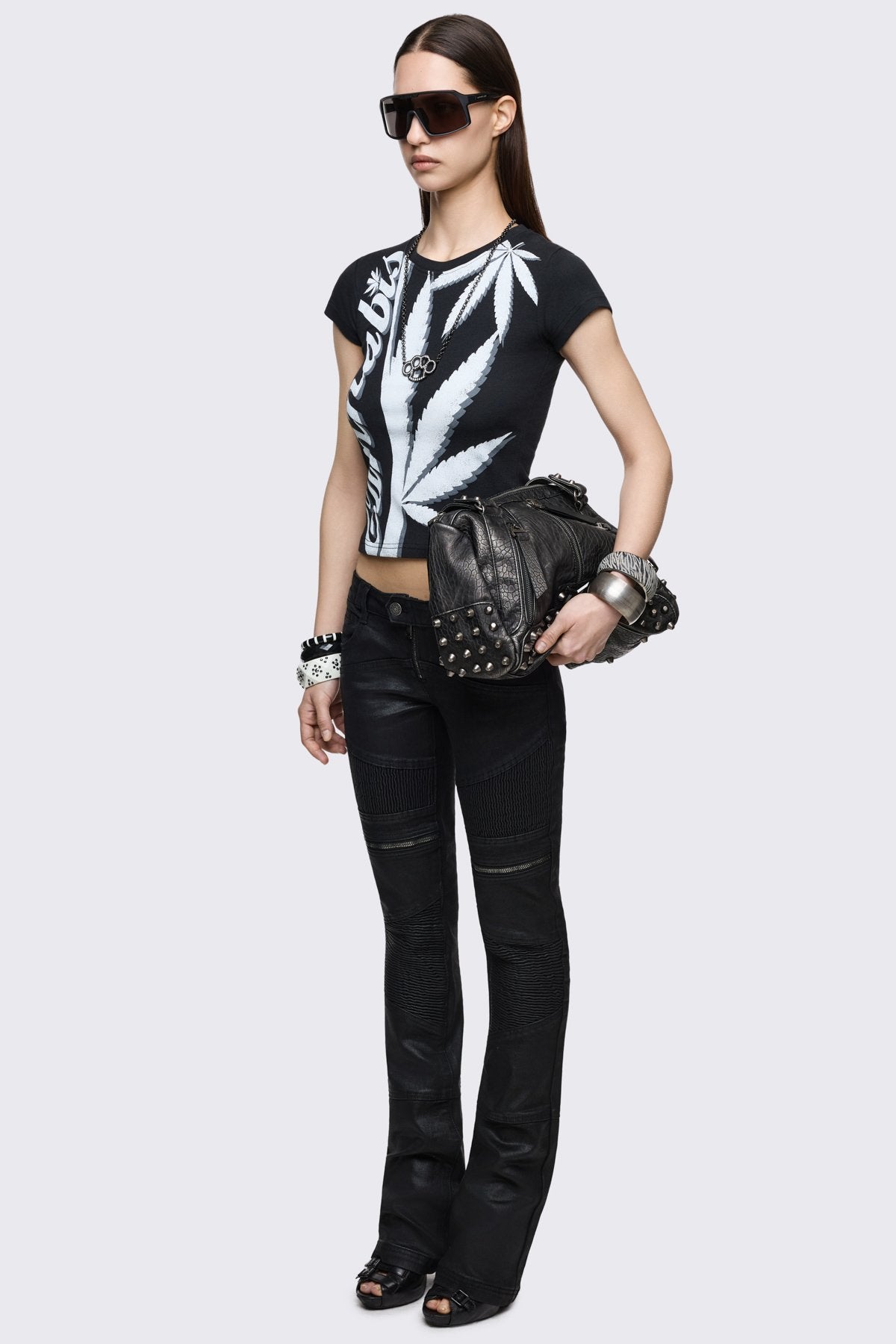 Black cotton baby tee with bold cannabis leaf graphic and logo print, fitted grunge style.