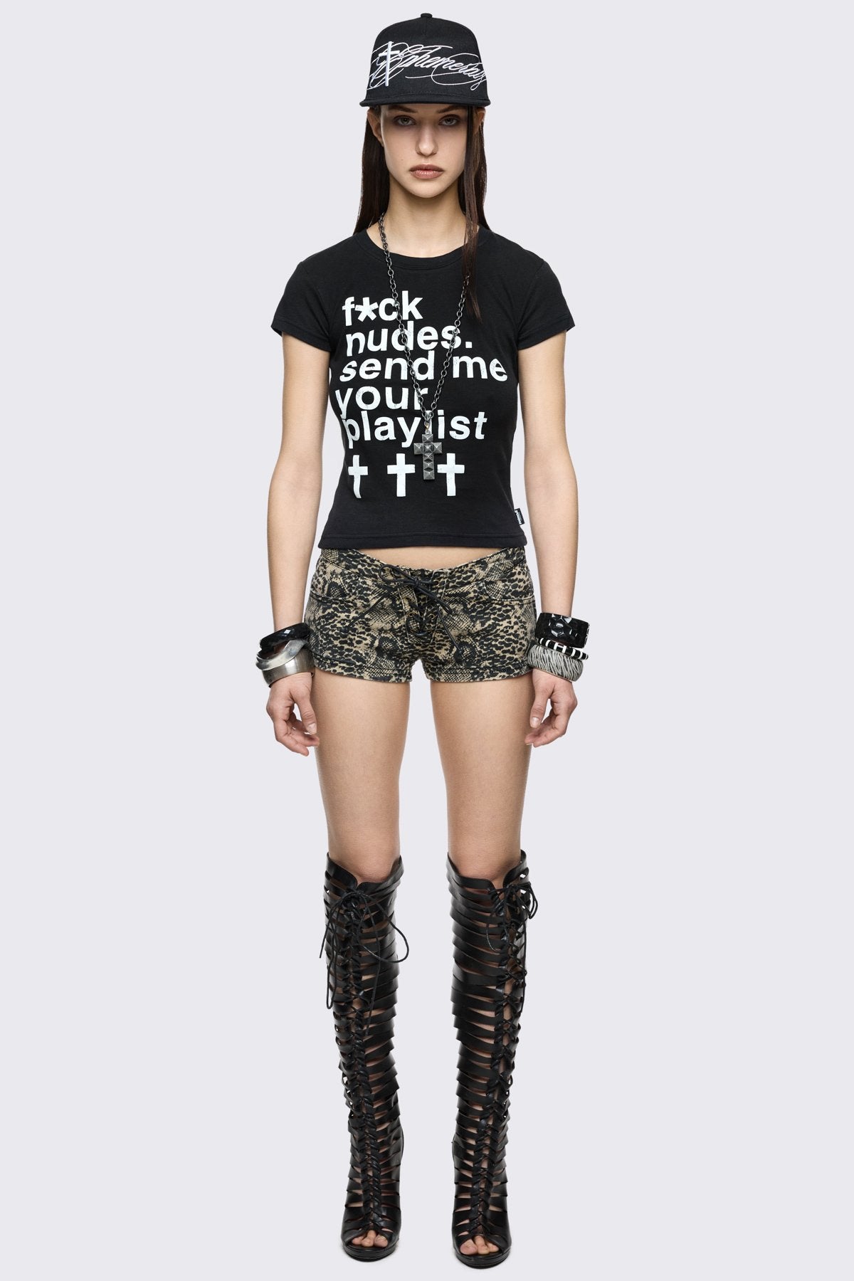 Black cotton baby tee with white slogan graphic print and grunge Y2K vibe.