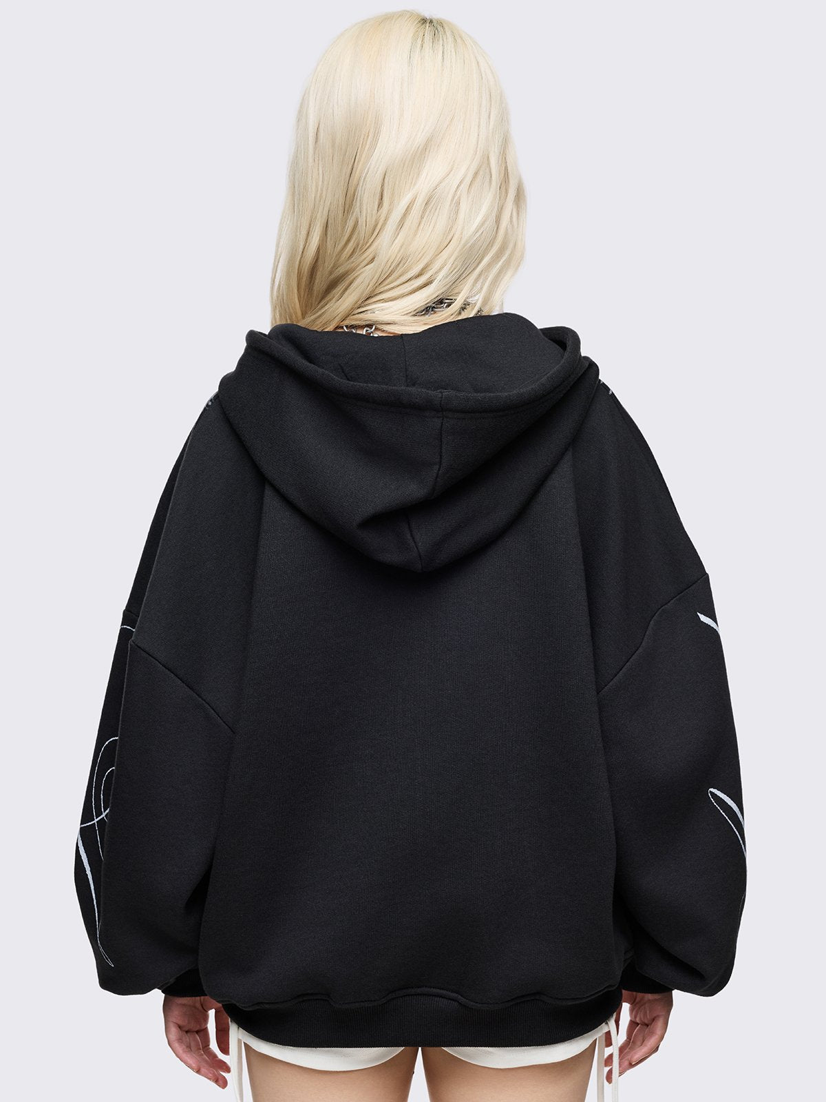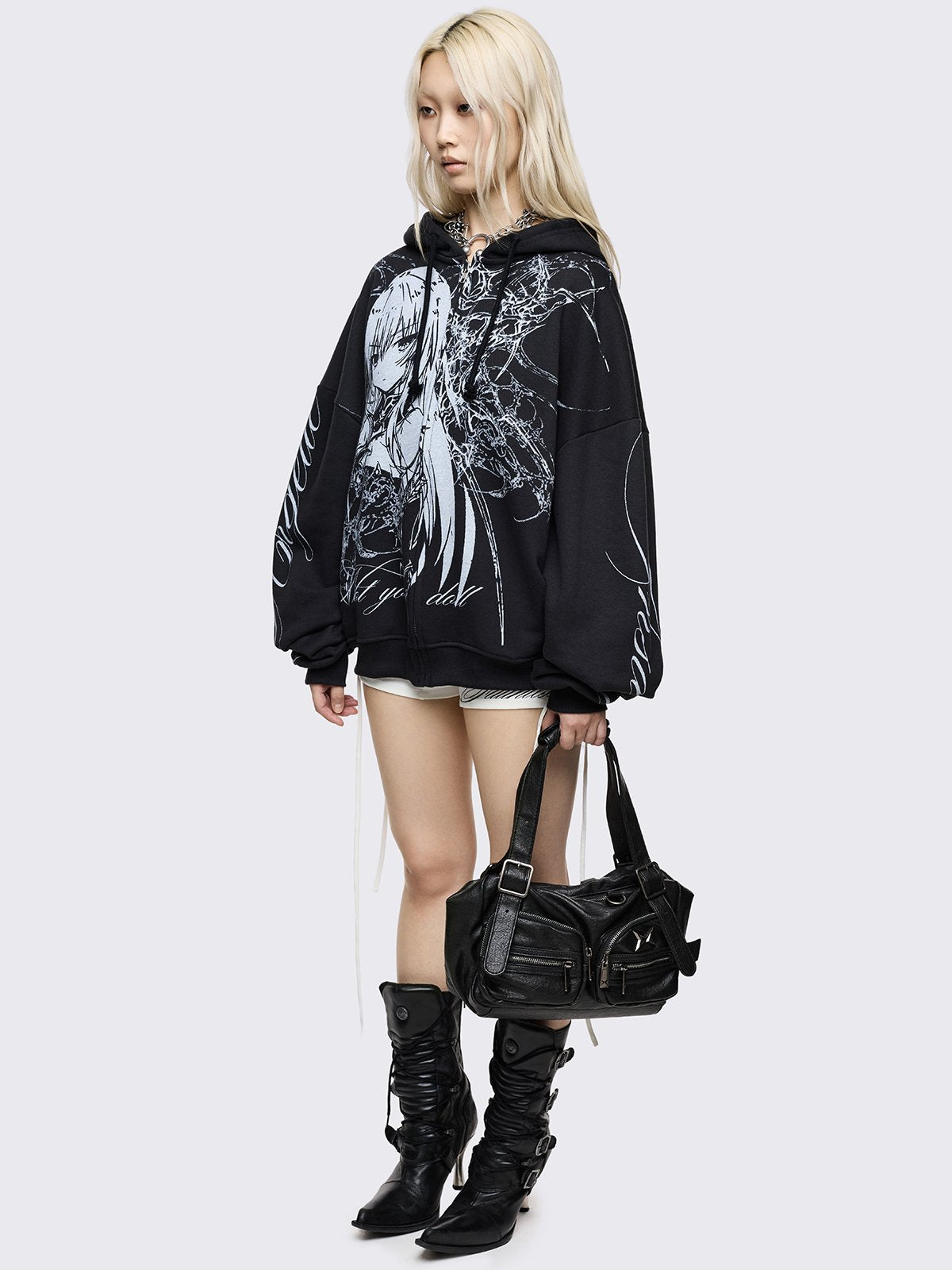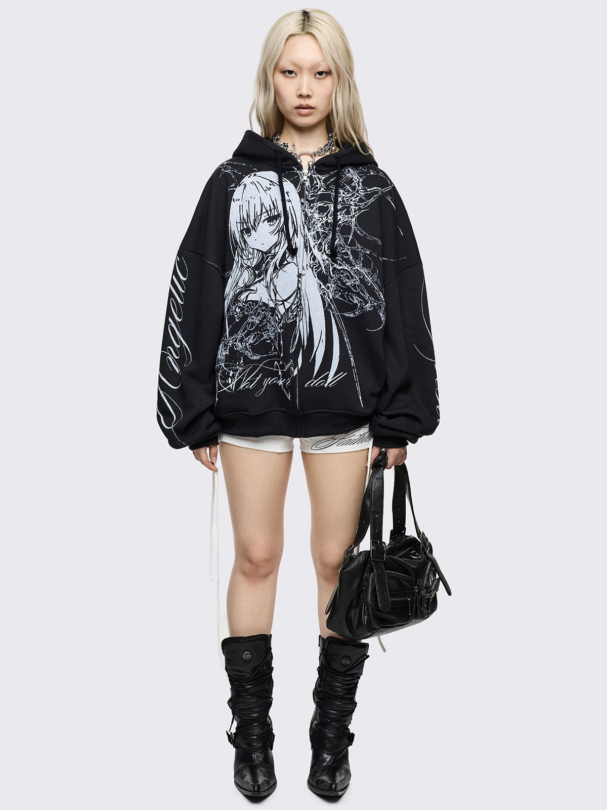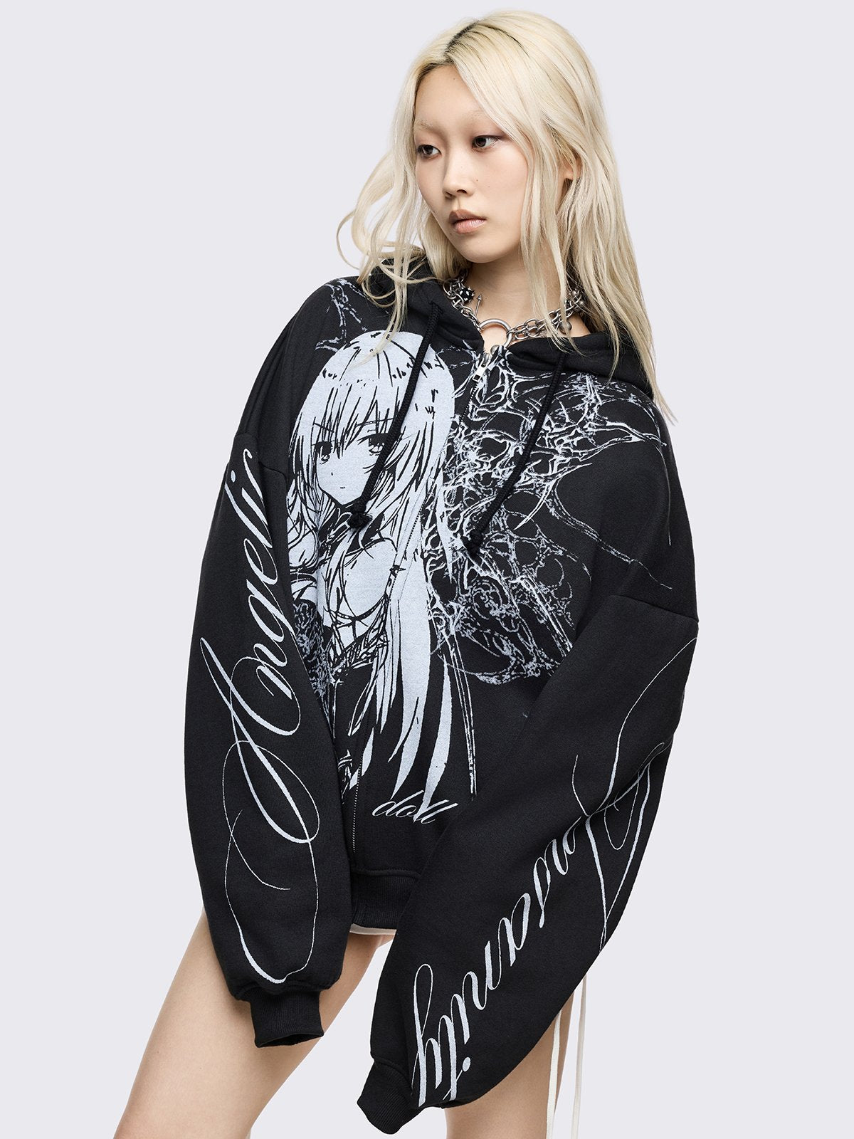 Black oversized zip up hoodie with "Not your doll" anime girl graphic front print and "Angelic insanity" print on sleeves.