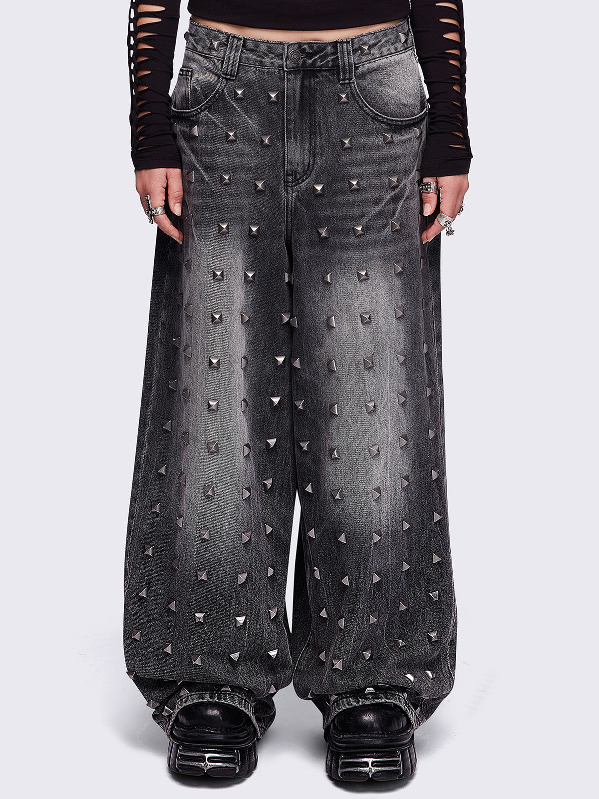 Black washed super baggy jeans with silver chunky eyelets along sides with O-rings. Oversized fit.