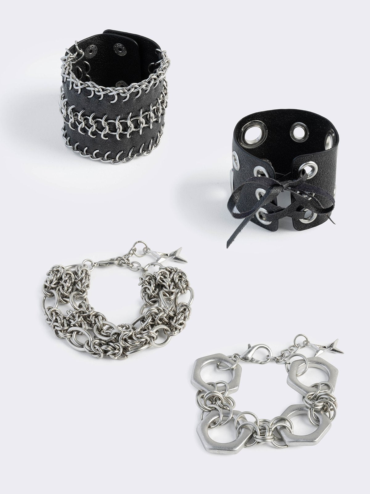 Set of 4 bracelets featuring spike, chain, locker and piercing details.
