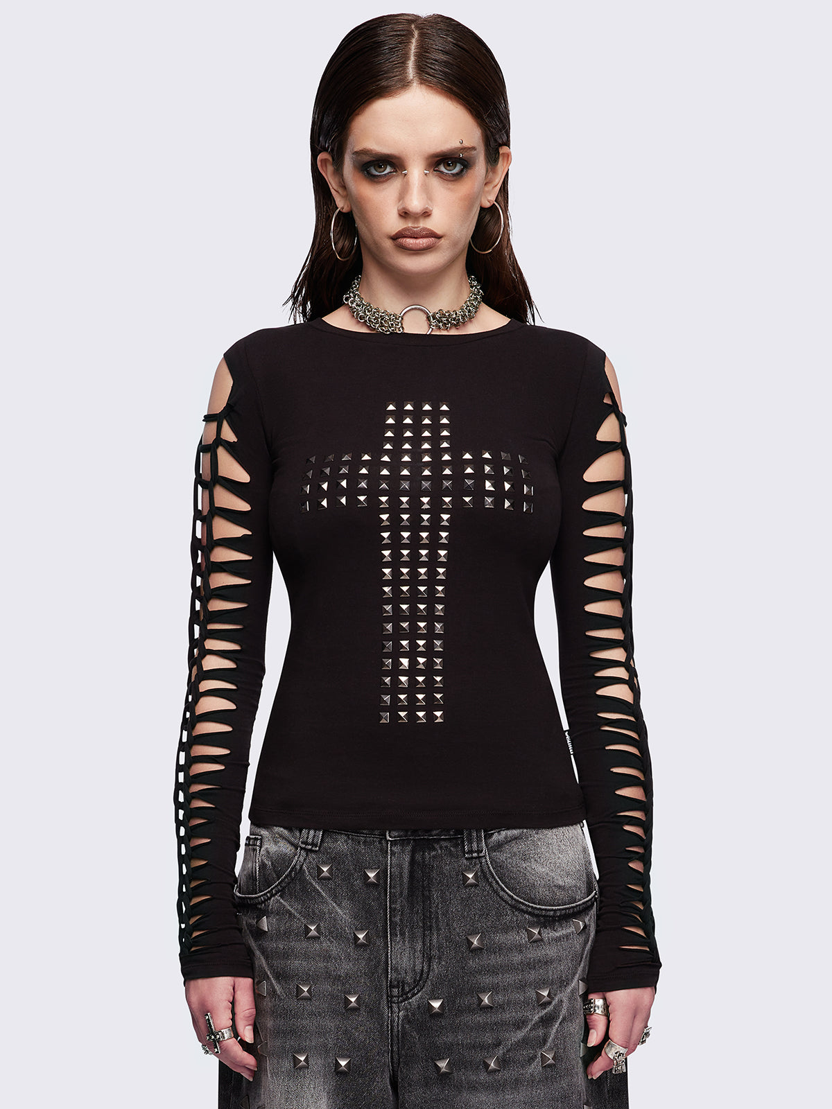 Grey cut-out long sleeve top with chunky silver eyelets on sleeves.