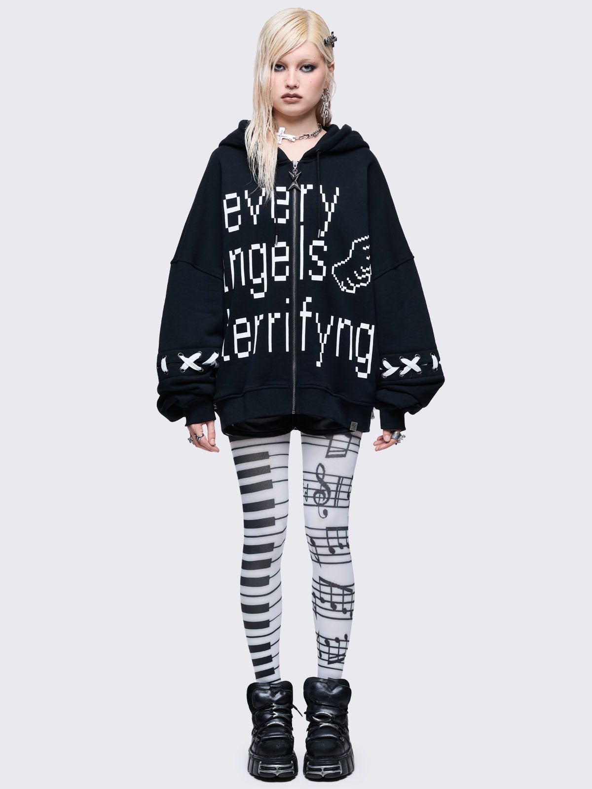 Black zip up hoodie jacket with "Every angels terrifying" graphic print and white lace-up details.