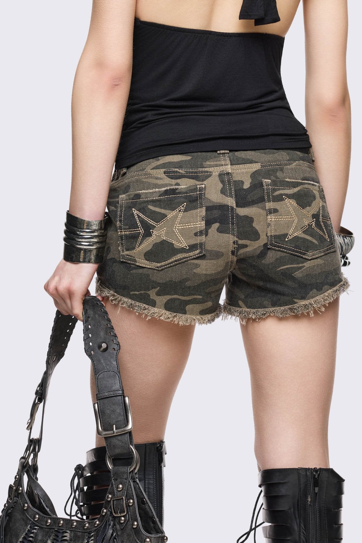 Camo micro shorts in stretch cotton with shredded details, exposed pockets, silver studs and raw hems, grunge vibe.