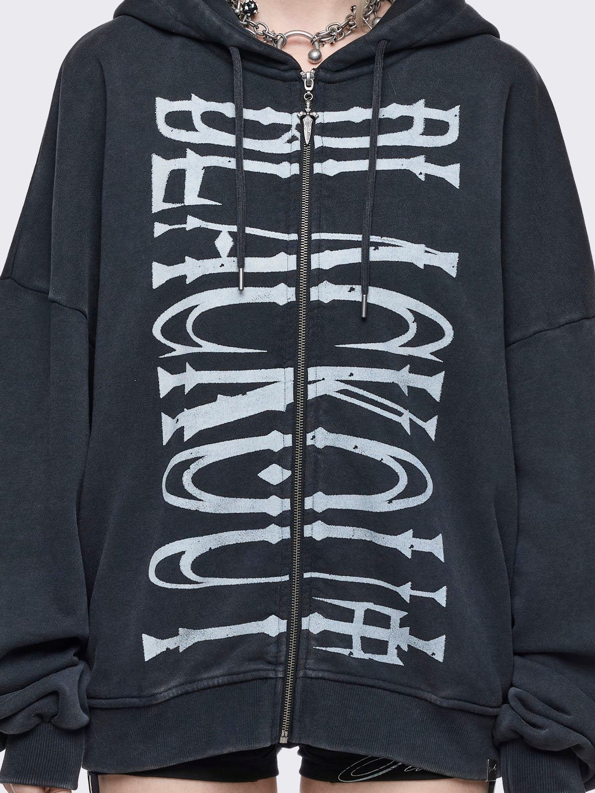 Grey washed zip up hoodie with "blackout" graphic front print in white.