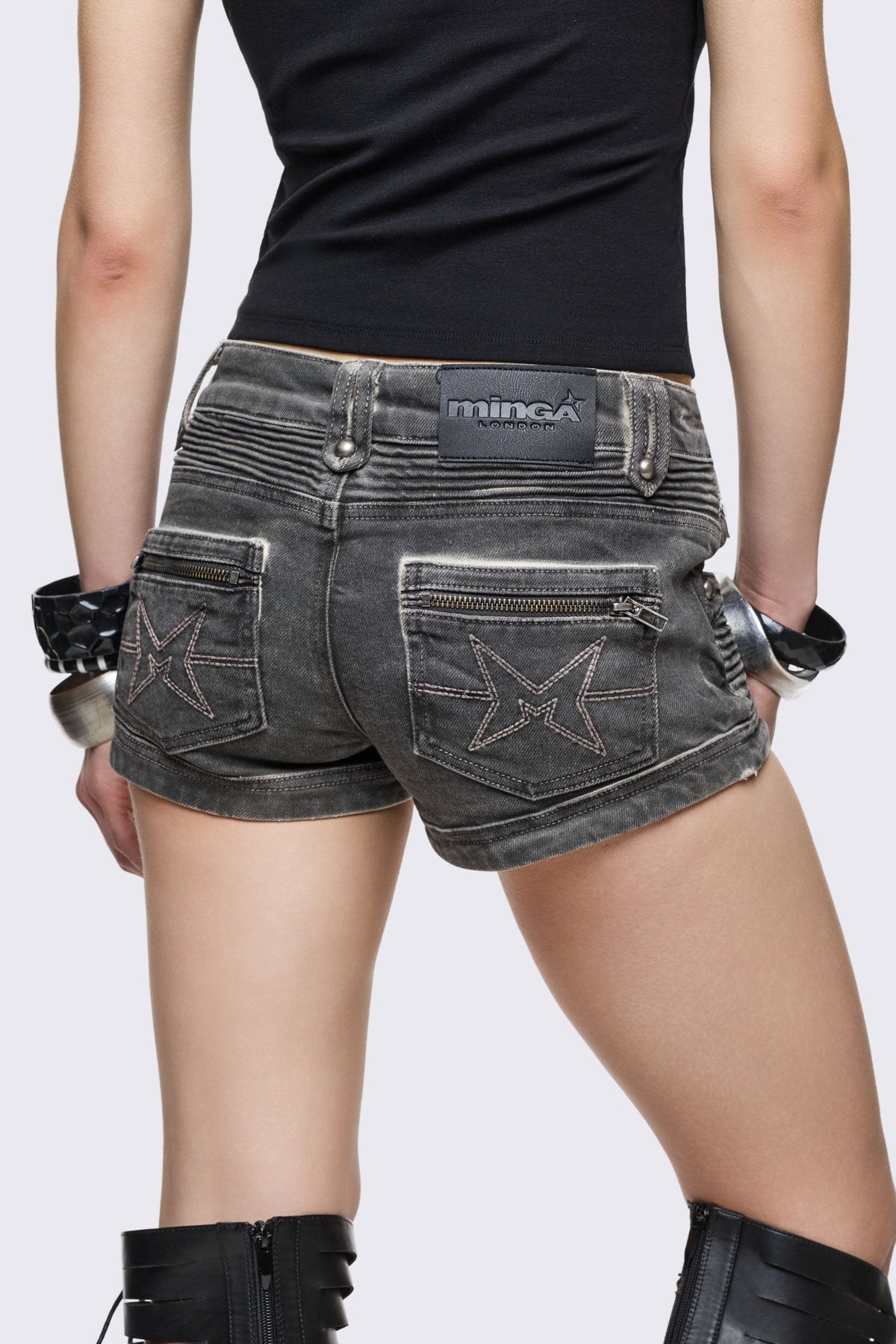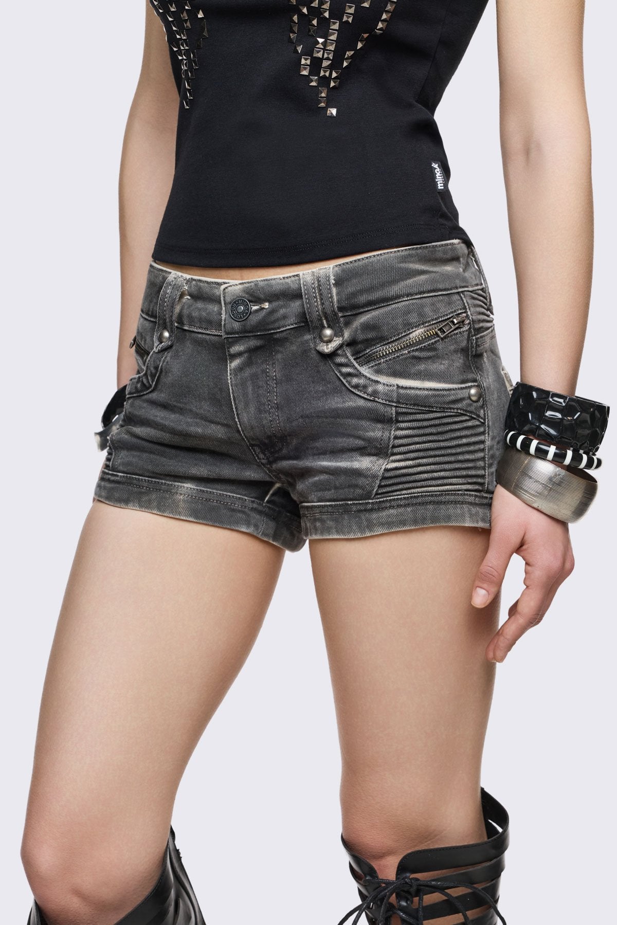 Grey acid-wash denim micro shorts with ribbed panels, zipper pockets and stud details in a grunge Y2K style.
