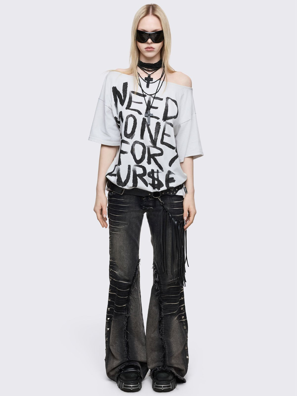 White oversized t-shirt with "Need money for pur$e" graphic front print and off-shoulder style.