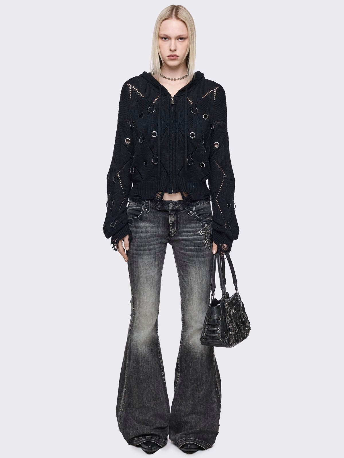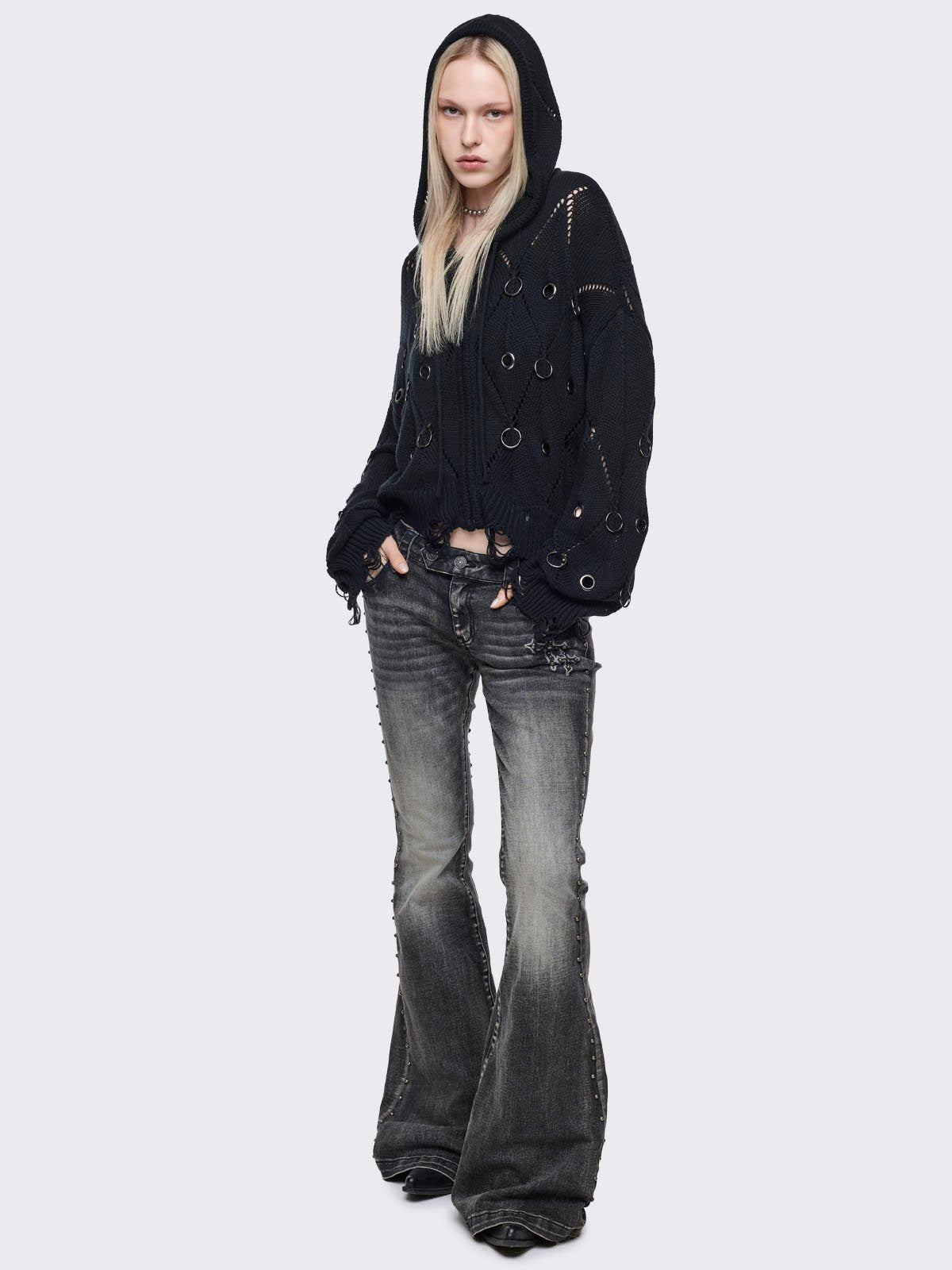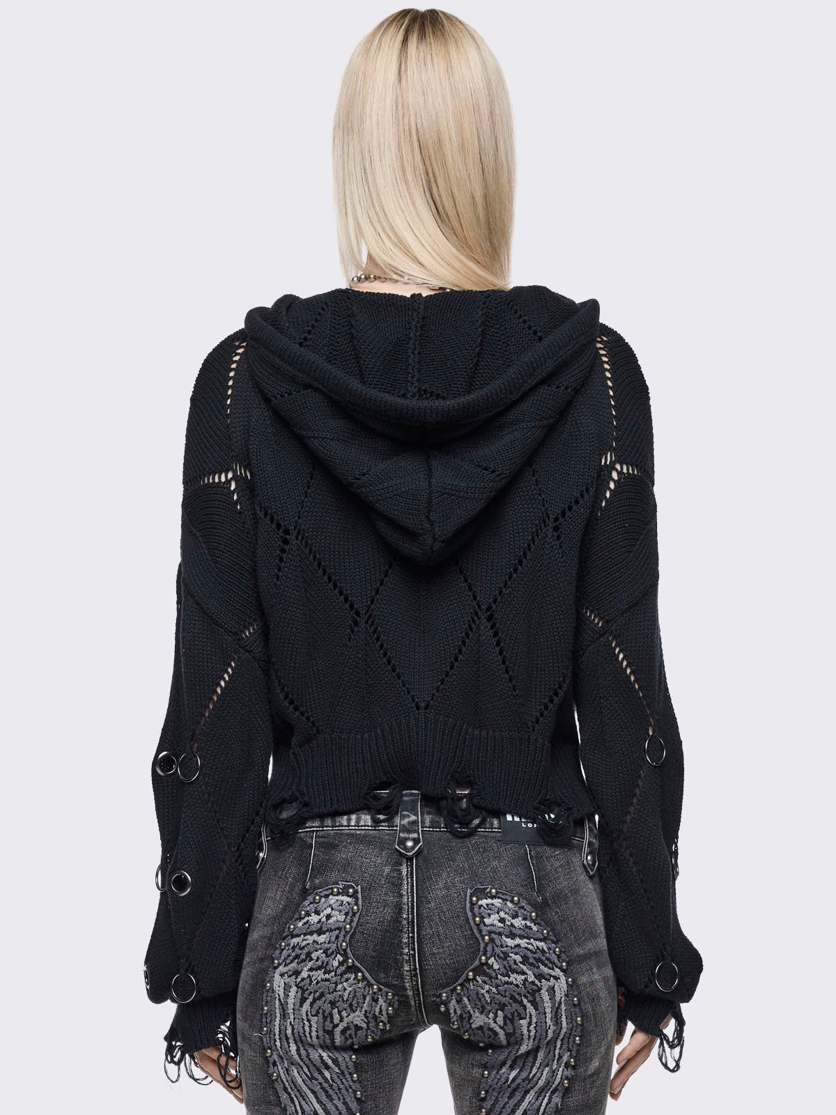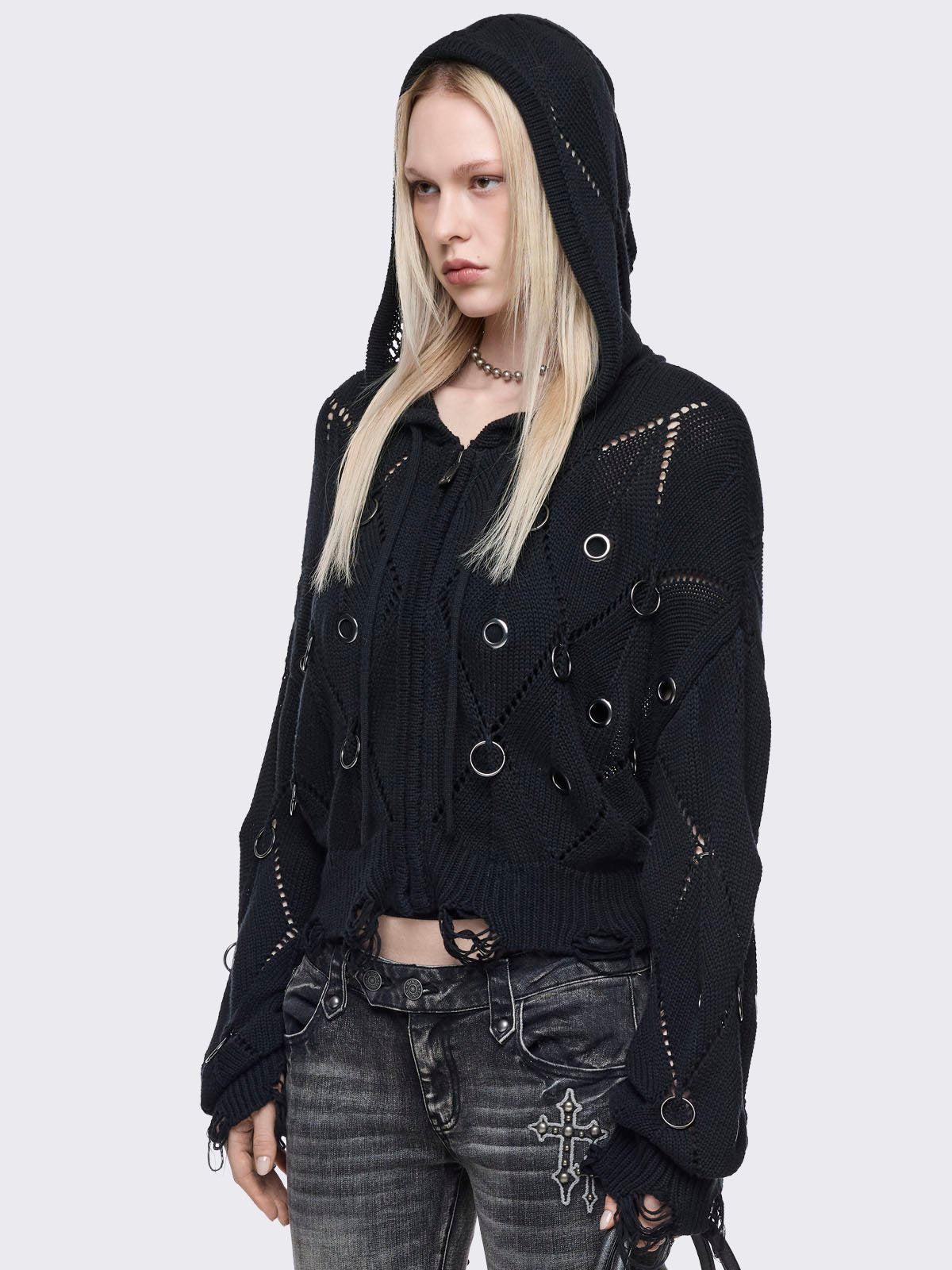 Black hood knitted cardigan with silver eyelets, o-ring, open-weave and distressed rib details.
